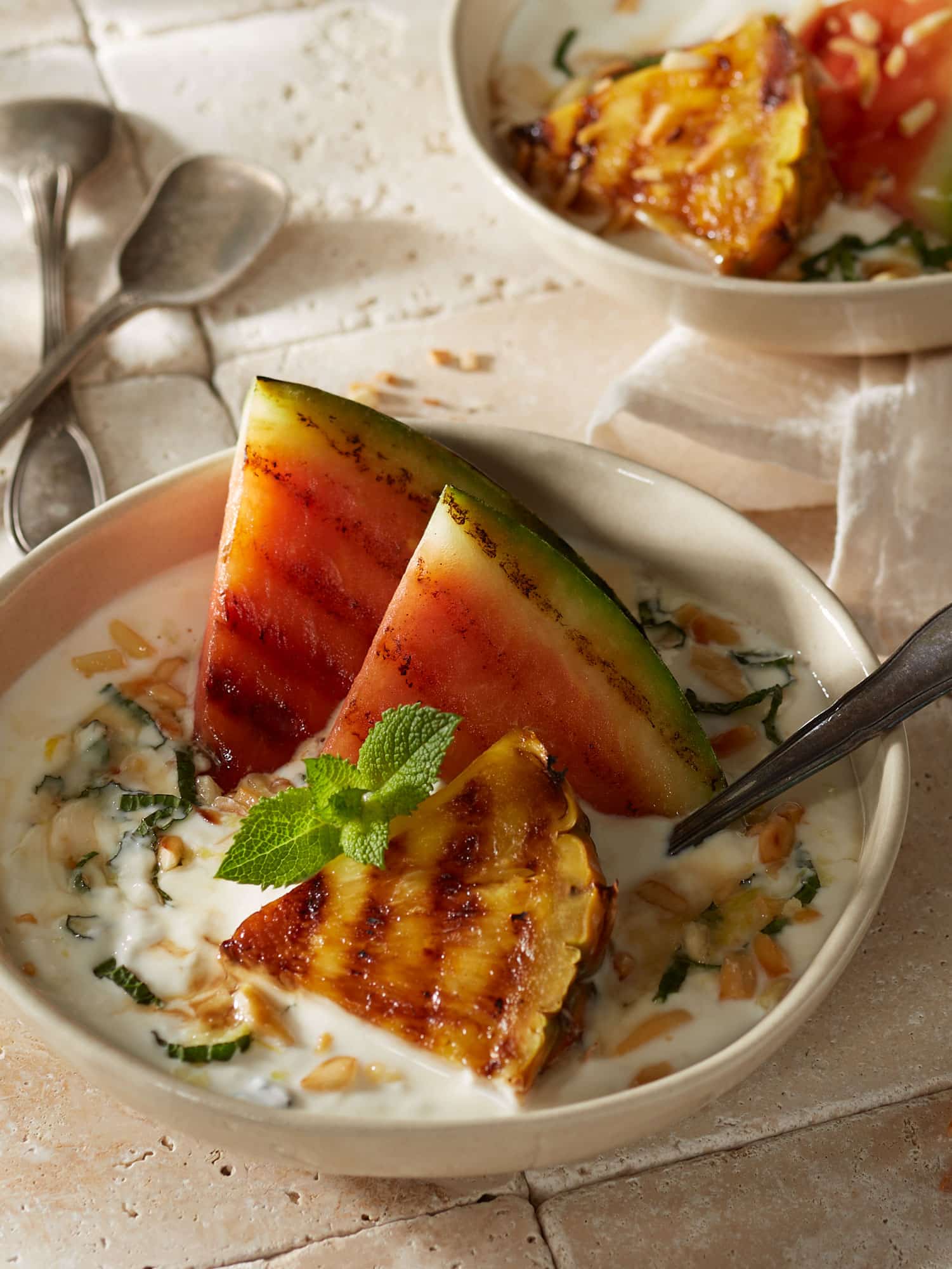 „Griechischer Joghurt mit gegrillter Wassermelone und Ananas, langsam gerösteten Mandeln, frischer Minze und süßem Honig, bei diesem Dessert harmonieren vielfältigste Aromen miteinander.“