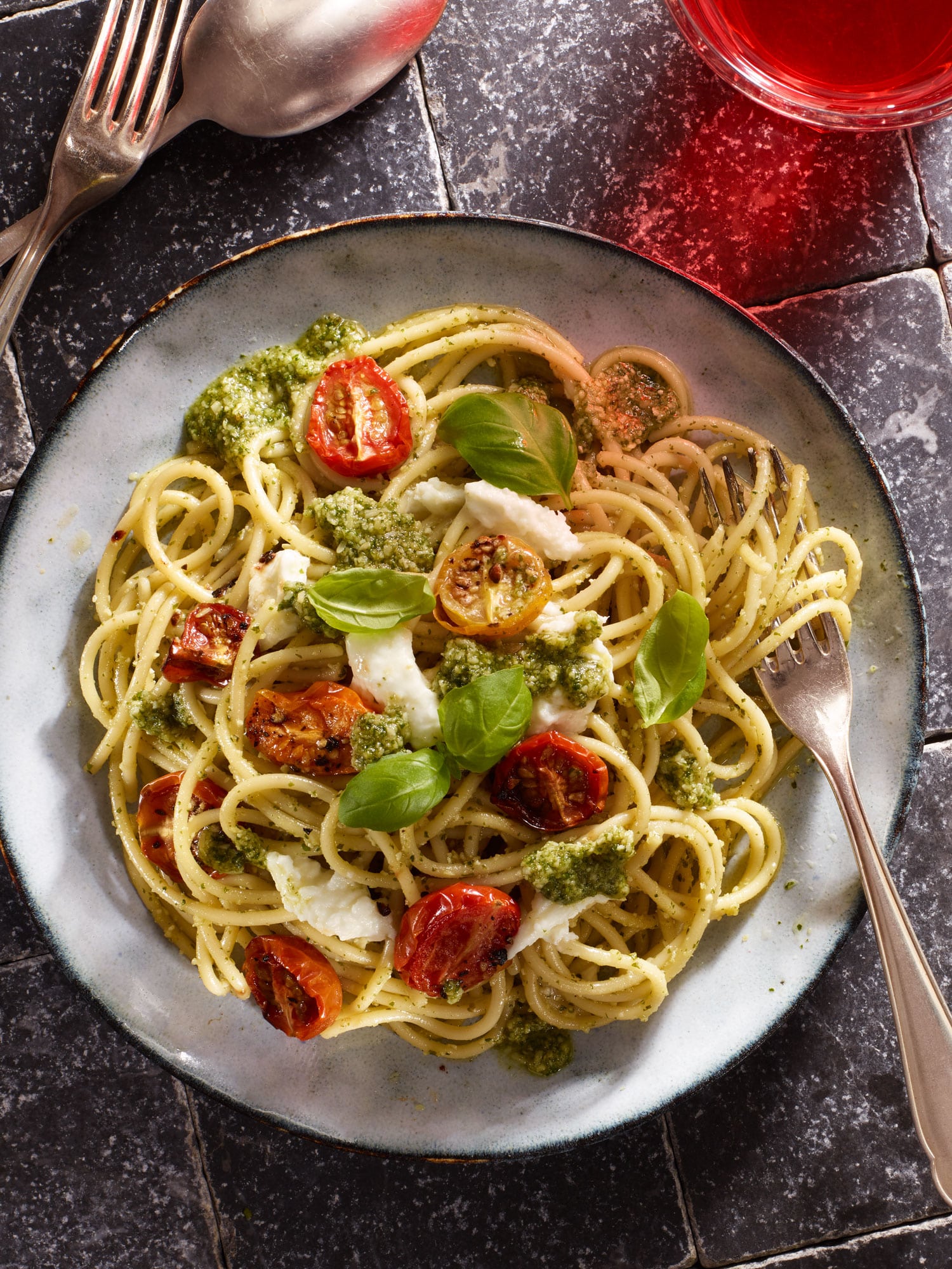 Spaghetti mit Basilikum-Pesto, Ofentomaten und Mozzarella